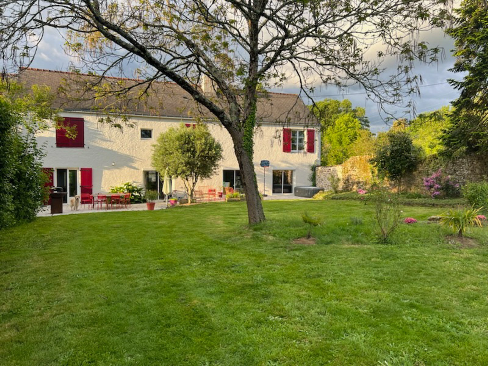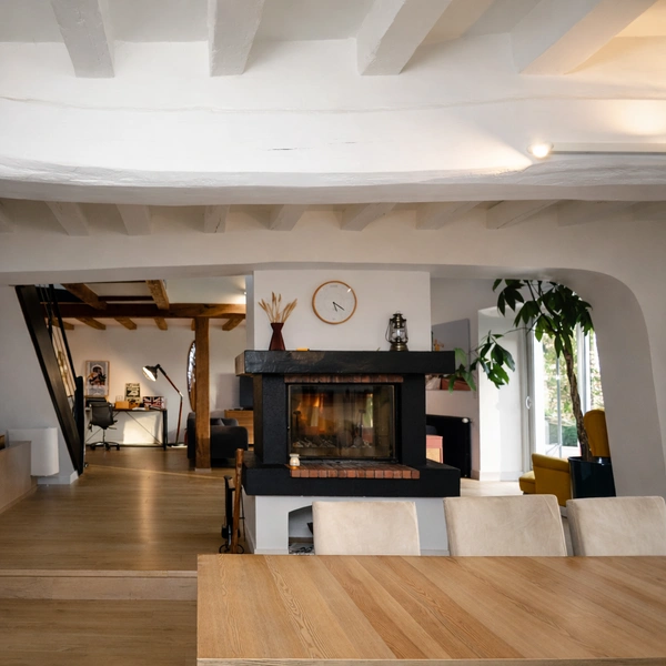 Séjour de 80 m2 orienté plein sud avec grandes ouvertures Cheminée centrale entre le salon et la salle à manger Dépendance indépendante aménageable, adaptée à une activité professionnelle ou un espace de travail